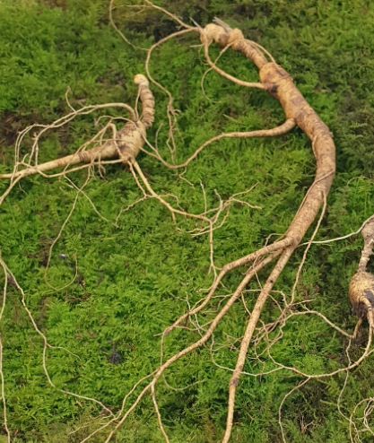 - 반면에 장뇌삼의 뿌리는 길쭉하게 자라며, 가늘고 연질한 느낌을 줍니다. 뿌리의 색깔은 연한 갈색이며, 어떤 방향으로도 치우치지 않고 자연스럽게 나란히 늘어져 있습니다.